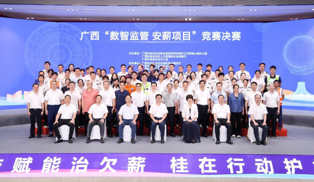 9月11日,广西“数智监管 安薪项目”竞赛决赛在南宁举行。自治区就业促进和劳动保护工作领导小组办公室副主任、自治区人力资源社会保障厅党组副书记、副厅长袁国华,自治区总工会副主席黄韬,自治区住房城乡建设厅、交通运输厅、水利厅等相关部门领导出席决赛现场并为获奖集体和个人颁奖。至此,为期2个月的广西“数智监管 安薪项目”竞赛圆满落下帷幕。