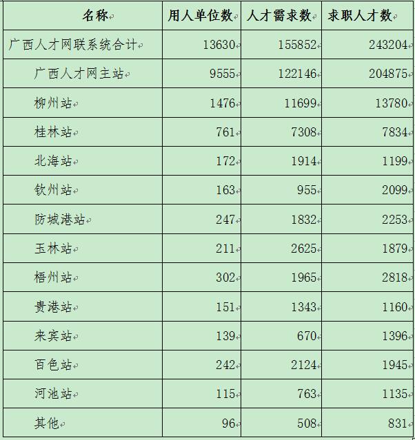 在各设区市人才网站分布中,广西人才网主站中用人单位共有9555家,需求人才数为122146人,求职人才数为204875人,占比分别为70.10%、78.37%84.24%,其人才供求比为1.68。