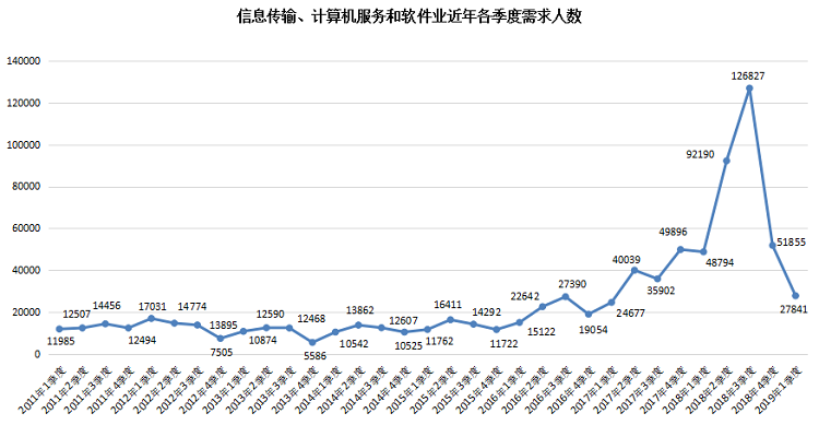 2019年第一季度,广西人才网联系统中信息传输、计算机服务和软件业的人才需求下滑明显,其人才需求量为27841人,比上年同期的48794人减少20953人,大幅下滑42.94%,环比降幅达到46.31%。其中,互联网和电子商务行业的人才需求分别为12823人和6221人,比上年同期分别减少12485人和6829人,同比降幅分别达到49.33%52.33%。