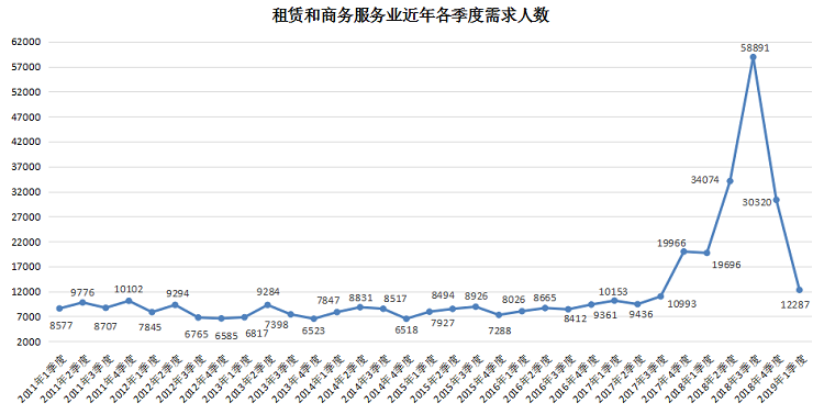 2019年第一季度,租赁和商务服务行业人才需求大幅下跌,需求人才数跌至12287人,与去年同期的19696人相比减少7409人,同比降幅达到37.62%,其中市场管理和职业中介服务业人才需求分别仅为796人和1417人,比上年同期分别减少6339人和530人,同比降幅分别达到88.84%27.22%。