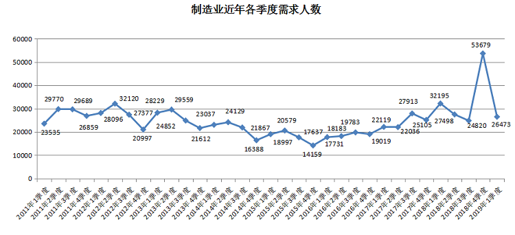 2019年第一季度,制造业人才需求同比大幅下降,其需求人才数为26473人,与去年同期的32195人相比减少5722人,降幅为17.77%,该行业类型中超过六成的分行业人才需求呈现不同程度的下滑。