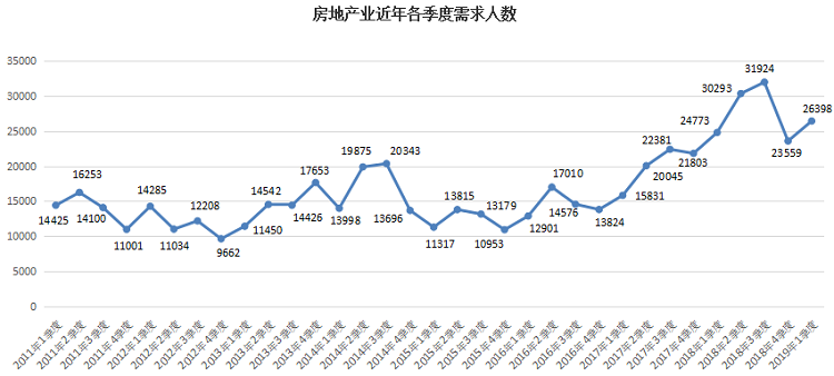 2019年第一季度,房地产业人才需求逆势增长,需求人才数为26398人,与去年同期的24773人相比增加1625人,同比小幅上涨6.56%。