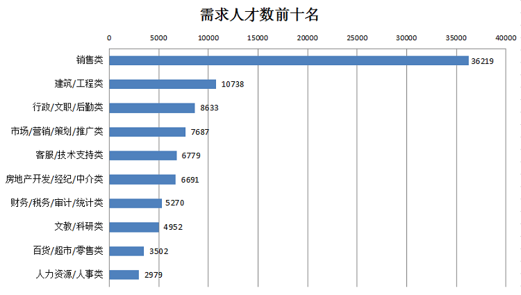 1. 位居需求榜前十名的职位:销售类、建筑/工程类、行政/文职/后勤类、市场/营销/策划/推广类、客服/技术支持类、房地产开发/经纪/中介类、财务/税务/审计/统计类、文教/科研类、百货/超市/零售类、人力资源/人事类等职位类型。这十个职位类型的需求人才数总计93450人,占人才总需求量的59.96%,其中销售类职位需求长期以绝对优势位居首位,其需求人才数达到36219人,占比达到23.24%,但比上年同期的42355人减少6136人,成为本季度需求量减少最大的职位类型,降幅为14.49%。