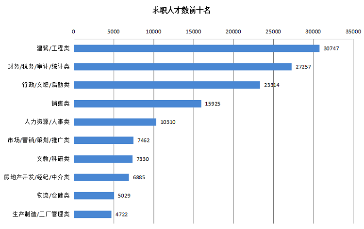 1. 位居求职榜前十名的职位:建筑/工程类、财务/税务/审计/统计类、行政/文职/后勤类、销售类、人力资源/人事类、市场/营销/策划/推广类、文教/科研类、房地产开发/经纪/中介类、物流/仓储类及生产制造/工厂管理类等职位类型。这十个职位类型的求职人才数量总计138981人,合计占比达到57.15%。其中,建筑/工程类、财务/税务/审计/统计类及行政/文职/后勤类这三类职位类型的求职人才数稳居前三位,均超过20000人。