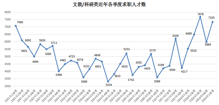 4.文教/科研类职位的求职人才数为7330人,比上年同期增加1810人,同比涨幅达到32.79%。