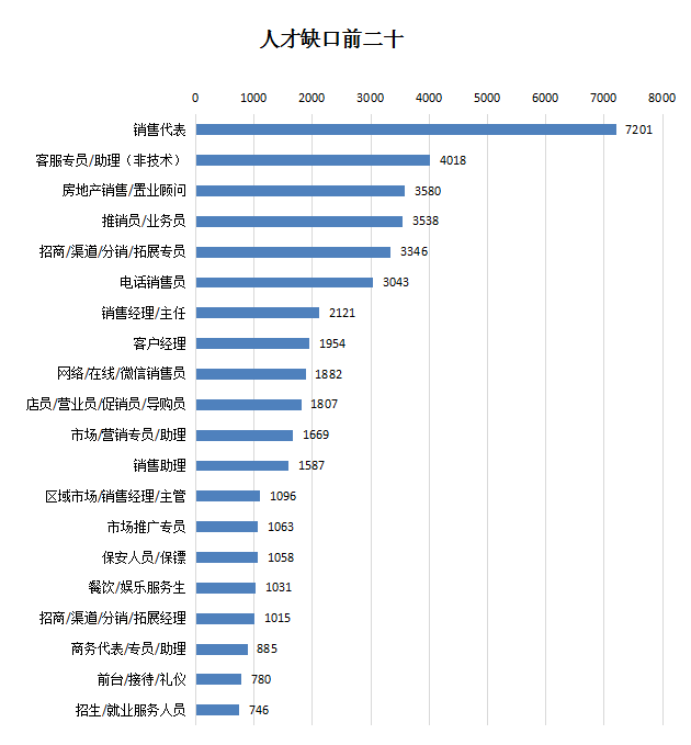 2019年第一季度,广西人才网联系统中业务类人才紧缺,在用人单位最急需人才的前二十名具体职位中,有超七成职位与业务挂钩,其中销售代表、客服专员/助理(非技术)以及房地产销售/置业顾问专员等职位分列前三名,这三个职位人才供给量极为缺乏,人才缺口(即需求人才数与求职人才数的差额,下同)分别达到7201人、4018人及3580人。