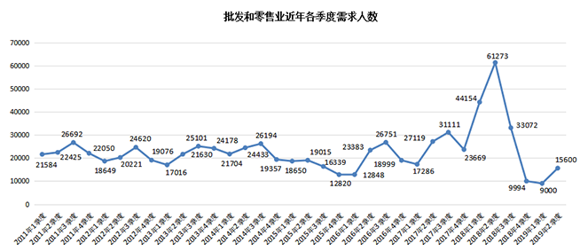2.批发和零售业中的贸易/进出口行业需求人才数减少至1321人,而上年同期为48500人,同比降幅高达97.28%,直接导致批发和零售业的总体需求人才数同比大幅下滑,降幅高达74.54%。
