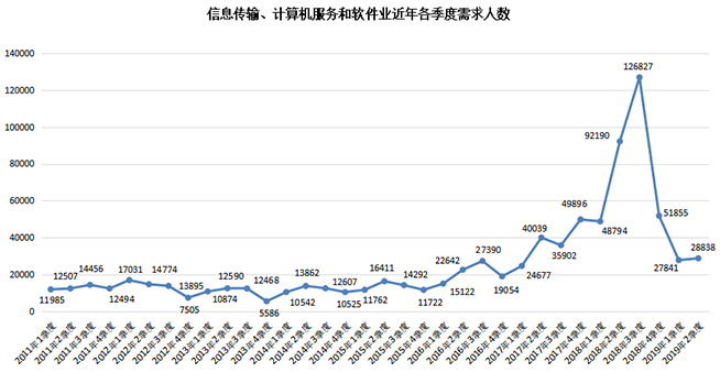 1.信息传输、计算机服务和软件业需求人才数为28838人,与上年同期的92190人相比减少了63352人,同比降幅高达68.72%。其中,电子商务和互联网行业需求人才数分别仅为6876人和7347人,比上年同期的47450人和33150人分别减少40574人和25803人,同比降幅分别达到85.51%和77.84%。