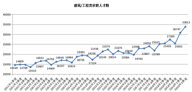 2019年第二季度,广西人才网联系统中建筑/工程类职位的求职人才数再创历史新高,达到33813人,与去年同期的25436人相比增加8377人,同比涨幅为32.93%。