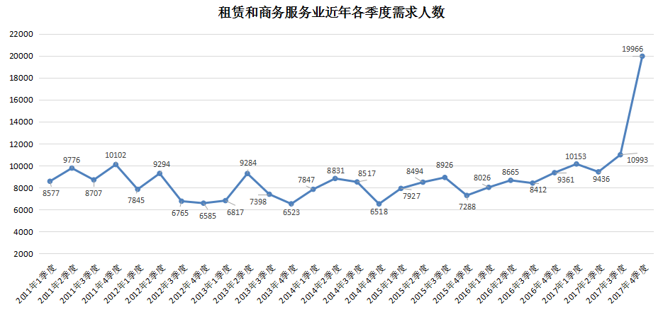 3. 租赁和商务服务行业需求出现突破性增长,其需求人才数达到19966人,达到历年最高值,与去年同期相比增加10605人,同比涨幅高达113.29%。