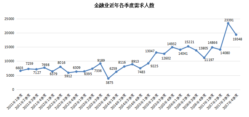 4. 金融业人才需求量为19348人,环比回落明显,但与去年同期的11197人相比仍增加8151人,同比涨幅达到72.80%。