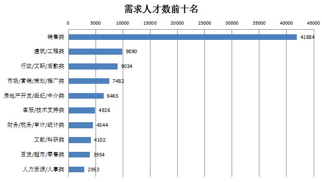 1. 位居需求榜前十名的职位:销售类、建筑/工程类、行政/文职/后勤类、市场/营销/策划/推广类、房地产开发/经纪/中介类、客服/技术支持类、财务/税务/审计/统计类、文教/科研类、百货/超市/零售类及人力资源/人事类等职位类型。这十个职位类型的需求人才数总计95234人,占人才总需求量的46.23%,其中销售类职位需求长期以绝对优势位居首位,其需求人才数达到41884人,比上年同期的27103人增加14781人,涨幅为54.54%。