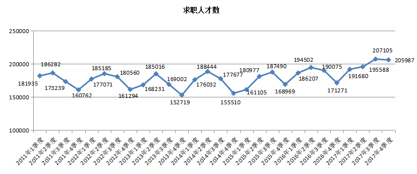 2017年第四季度,广西人才网联系统的求职人才数达到205987人,人才供应小幅增长,同比涨4.67%。