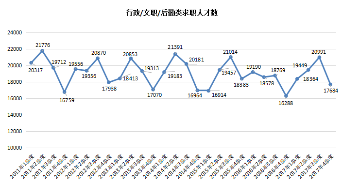 3. 行政/文职/后勤类职位的人才供应量环比回落明显,但同比仍出现一定增长。其求职人才数为17684人,与上年同期相比增加1396人,同比增长8.57%。