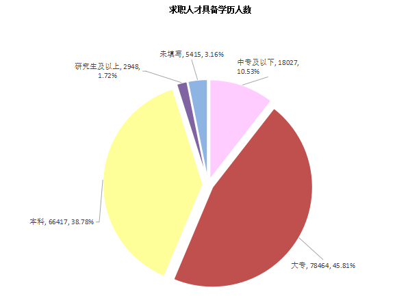 5. 广西人才网联系统求职人才学历长期集中在大专和本科学历,其求职人才数占比分别为45.81%和38.78%,大专和本科学历的求职人才共计151799人,与上年同期的144881人相比增加6918人,增长4.77%。