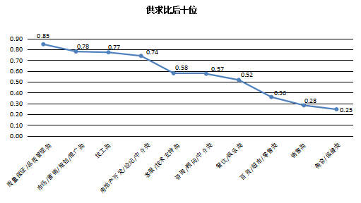 其中,由于需求极少,化工类、计算机硬件开发类及生物/医药/医疗器械类等职位就业竞争压力较大,其供求比分别高达13.47、9.27及5.17,位居供求比前三位;而服务业三类职位和销售类等职位由于人员流动性大等特征,需求长期旺盛,供求比长期位居供求比后十位,其合计供求比分别仅为0.40和0.28。