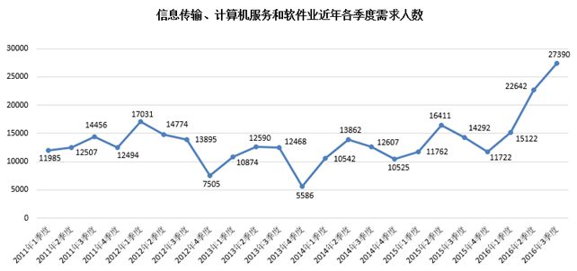 2、信息传输/计算机服务和软件业人才需求量直线飙升,逼近三万人水平,达到27390人,同比增加13098人,涨幅高达91.65%;