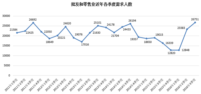 3、虽然零售业持续低迷,但贸易/进出口行业人才需求突破性增长带动整个批发和零售业行业的快速增长,并创下历史新高,其人才需求量首次达到26751人,与去年同期的16339人相比增加10412人,涨幅高达63.72%;