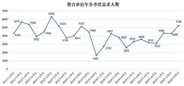 4、教育行业需求回暖,其需求人才数达到5266人,与去年同期的3215人相比增加2051人,同比涨幅达到63.79%。