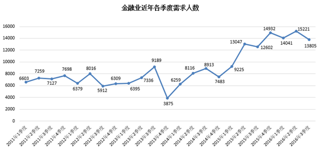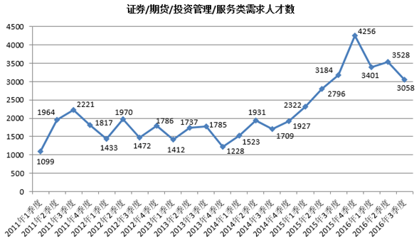 4、证券/期货/投资管理/服务类职位人才需求回落明显,虽然其人才需求量为3058人,与去年同期相比增加126人,同比涨幅为3.96%,但近三个季度呈现明显回落态势,本季度环比下滑13.32%;