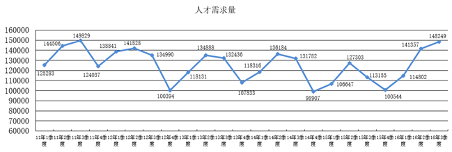 2016年三季度,通过广西人才网联系统招聘人才的用人单位共11375家,与去年同期相比小幅上涨5.68%。从历年人才需求量趋势图中可以看出,一般三季度会出现明显的季节性下滑,但2016年三季度需求走势一反常态地呈现上扬趋势,本季度人才需求量达到148249人,同比大幅增长31.01%,环比增长4.88%,仅次于2011年三季度达到的峰值。