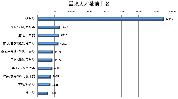 1、位居需求榜前十名的职位:销售类、行政/文职/后勤类、建筑/工程类、市场/营销/策划/推广类、房地产开发/经纪/中介类、百货/超市/零售类、客服/技术支持类、财务/税务/审计/统计类、文教/科研类及技工类等职位类型。这十个职位类型的需求人才数总计80865人,占人才总需求量的54.55%,其中销售类职位需求长期以绝对优势位居首位,其需求人才数达到37447人,比去年同期增加8092人,大幅增长27.57%。