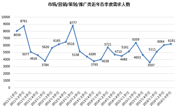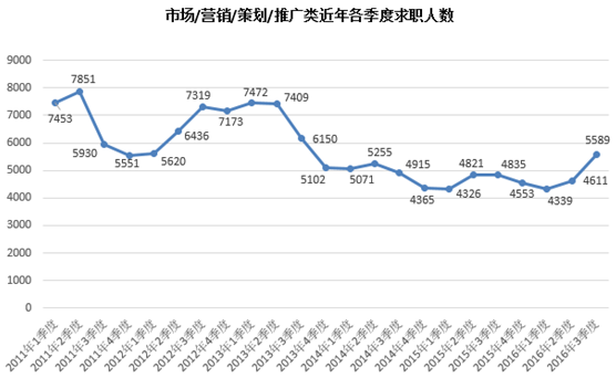 2016年三季度,市场/营销/策划/推广类职位的求职人才数为5589人,与去年同期相比增加754人,同比增长15.59%。