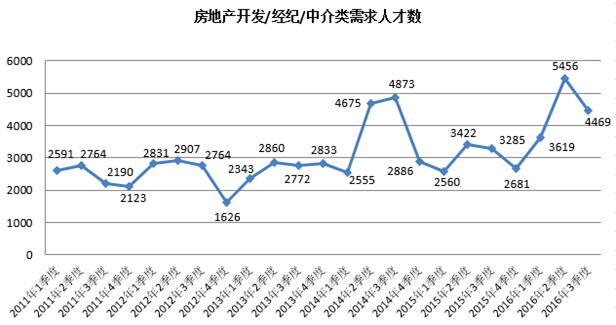 2016年三季度,广西人才网联系统中房地产开发/经纪/中介类职位人才需求量为4469人,环比呈现明显的季节性回落,环比下降18.09%,但与去年同期的3285人相比仍增加1184人,大幅增长36.04%,成为本季度需求增长量第三位的职位类型。其中,房地产中介/交易是该职位大类人才需求的主要增长点,其人才需求量达到1517人,与去年同期相比增加了930人,增幅高达158.43%。