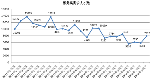 2016年三季度,广西人才网联系统中服务类职位总需求为7912人,同比小幅下滑6.48%。其中百货/超市/零售类和美容/保健类职位需求量分别为4465人和760人,比去年同期相比分别减少742人和132人,同比降幅分别达到14.25%和14.80%。而餐饮/娱乐类职位需求量位2687人,同比增加326人,大幅增长13.81%。