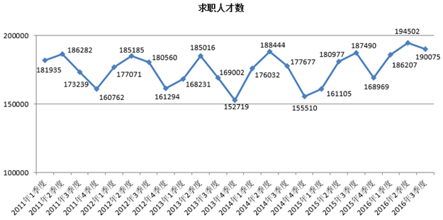 2016年三季度,广西人才网联系统的求职人才数达到190075人,虽然呈现一定的季节性回落,但比去年同期仍小幅增长了1.38%,继续维持在十九万人水平上。