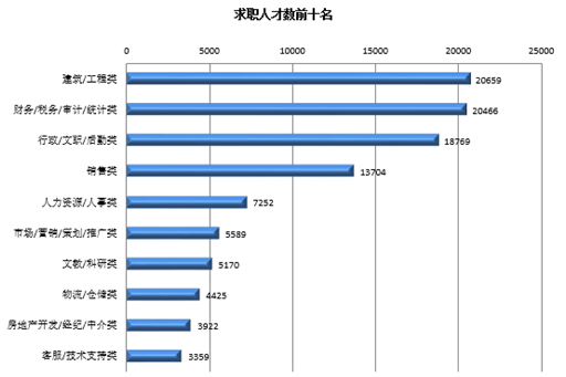 1、位居求职榜前十名的职位:建筑/工程类、财务/税务/审计/统计类、行政/文职/后勤类、销售类、人力资源/人事类、市场/营销/策划/推广类、文教/科研类、物流/仓储类、房地产开发/经纪/中介类及客服/技术支持类等职位类型。这十个职位类型求职人才数量总计103315人,其中,建筑/工程类、财务/税务/审计/统计类及行政/文职/后勤类这三类职位类型求职人才数位居前三位,均超过18000人;