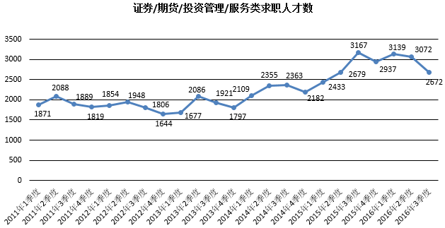 2016年三季度,广西人才网联系统中证券/期货/投资管理/服务类职位的人才供应出现较大下滑,其求职人才数为2672人,与去年同期相比减少495人,同比大幅下滑15.63%,环比下滑13.02%。