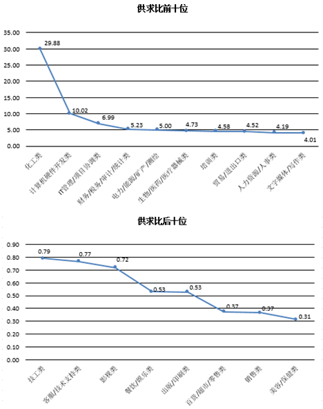 2、化工类、计算机硬件开发类及IT管理/项目协调类等职位供求比分别高达29.88、10.02及6.99,位居供求比前三位;而美容/保健类、销售类及百货/超市/零售类等职位供求比分别仅为0.31、0.37及0.37,位居供求比后三位。