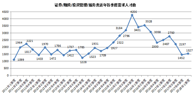 受证券市场持续低迷和监管力度加大的影响,2018年第一季度,广西人才网联系统中金融业人才需求量为13664人,环比回落明显,与去年同期的14866人相比减少1202人,同比下滑8.09%。