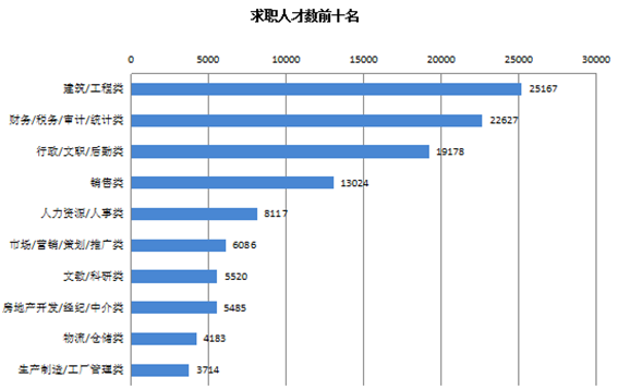 2. 建筑/工程类职位的求职人才数为25167人,创历史新高,与去年同期相比增长2261人,同比涨幅为9.87%。
