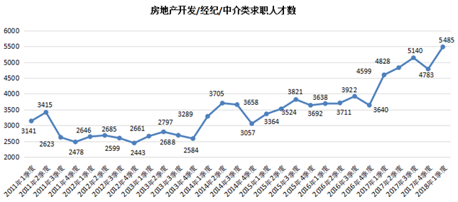 2018年第一季度,广西人才网联系统中房地产开发/经纪/中介类职位的人才供应量创历史新高,其求职人才数为5485人,与上年同期相比增加886人,同比涨幅达到19.27%。