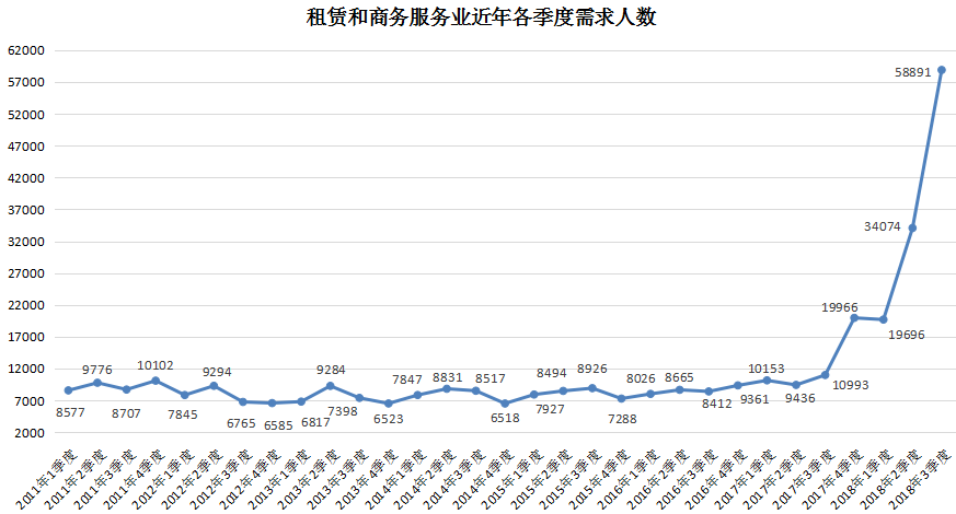 3. 租赁和商务服务业人才需求再创新高,突破5万大关,其需求人才数达到58891人,与去年同期的10993人相比增加47898人,同比涨幅高达435.71%,成为本季度人才需求增长幅度最大的行业类型。
