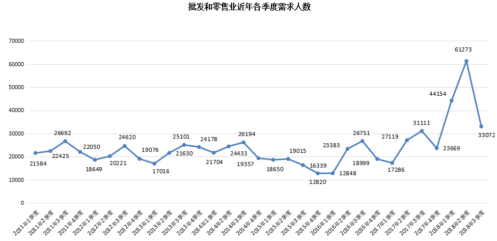 6. 批发和零售业人才需求环比回落明显,其人才需求量为33072人,环比大幅下滑46.03%。