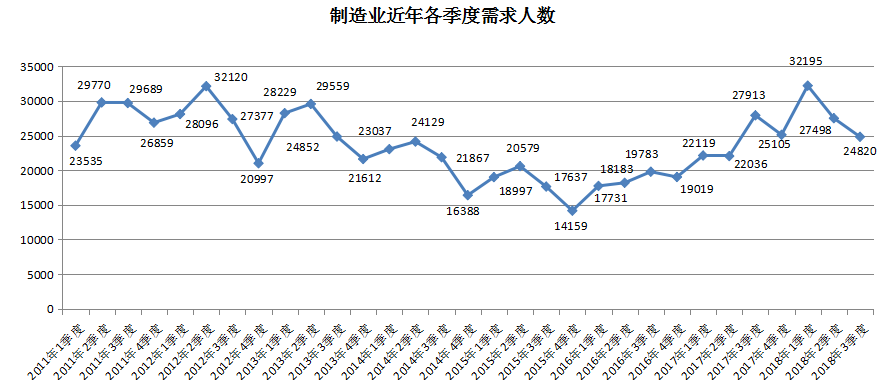 7. 制造业人才需求呈现下滑趋势,其需求人才数达到24820人,与去年同期的27913人相比减少3093人,同比下滑11.08%。