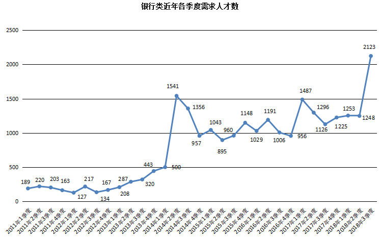 6. 银行类职位人才需求量创历史新高,达到2123人,与上年同期的1126人相比增加997人,同比大幅增长88.54%。